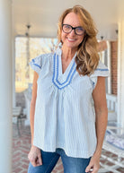 Add effortless charm to your wardrobe with the Striped Flutter Sleeve Top by Umgee. Designed with a flattering vertical pinstripe, this top creates a lengthening effect while maintaining a light, airy feel perfect for everyday wear.