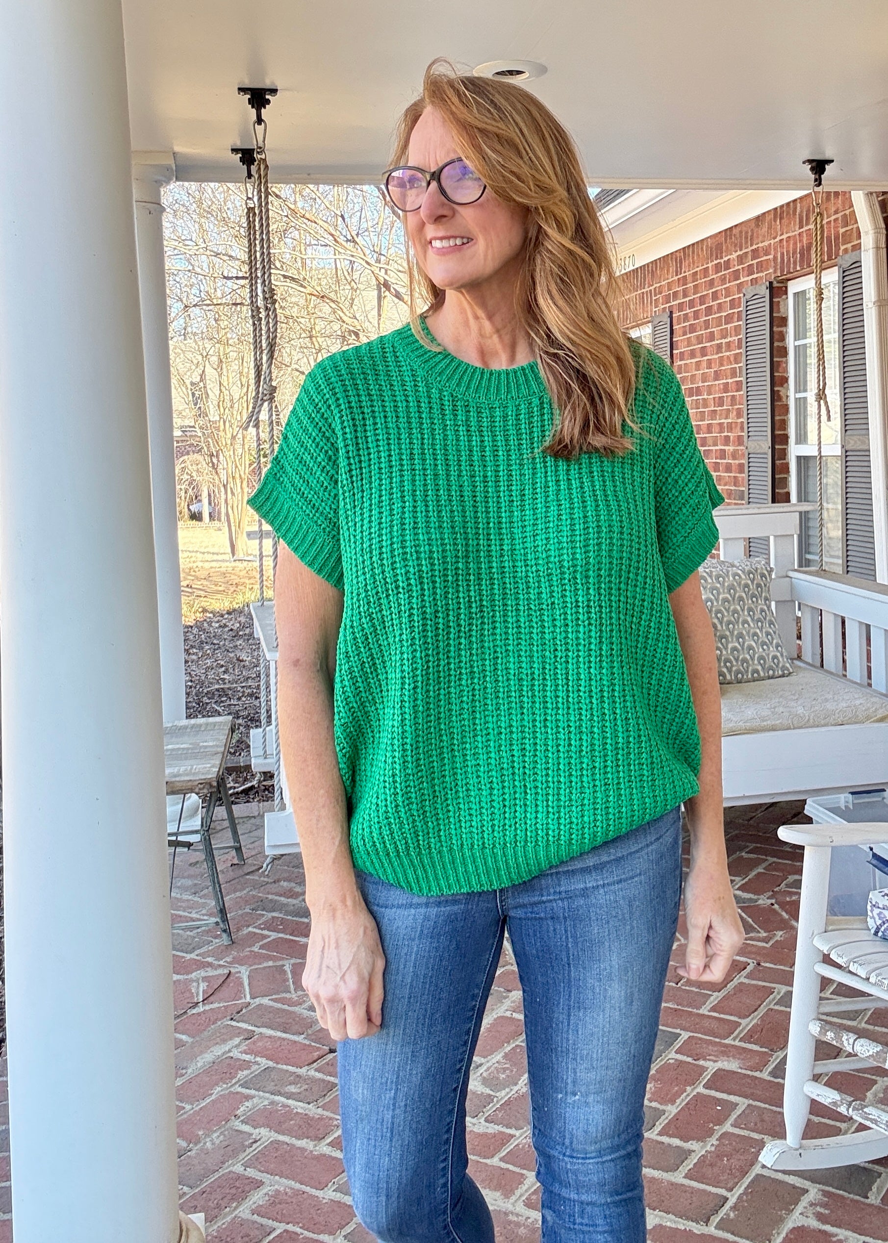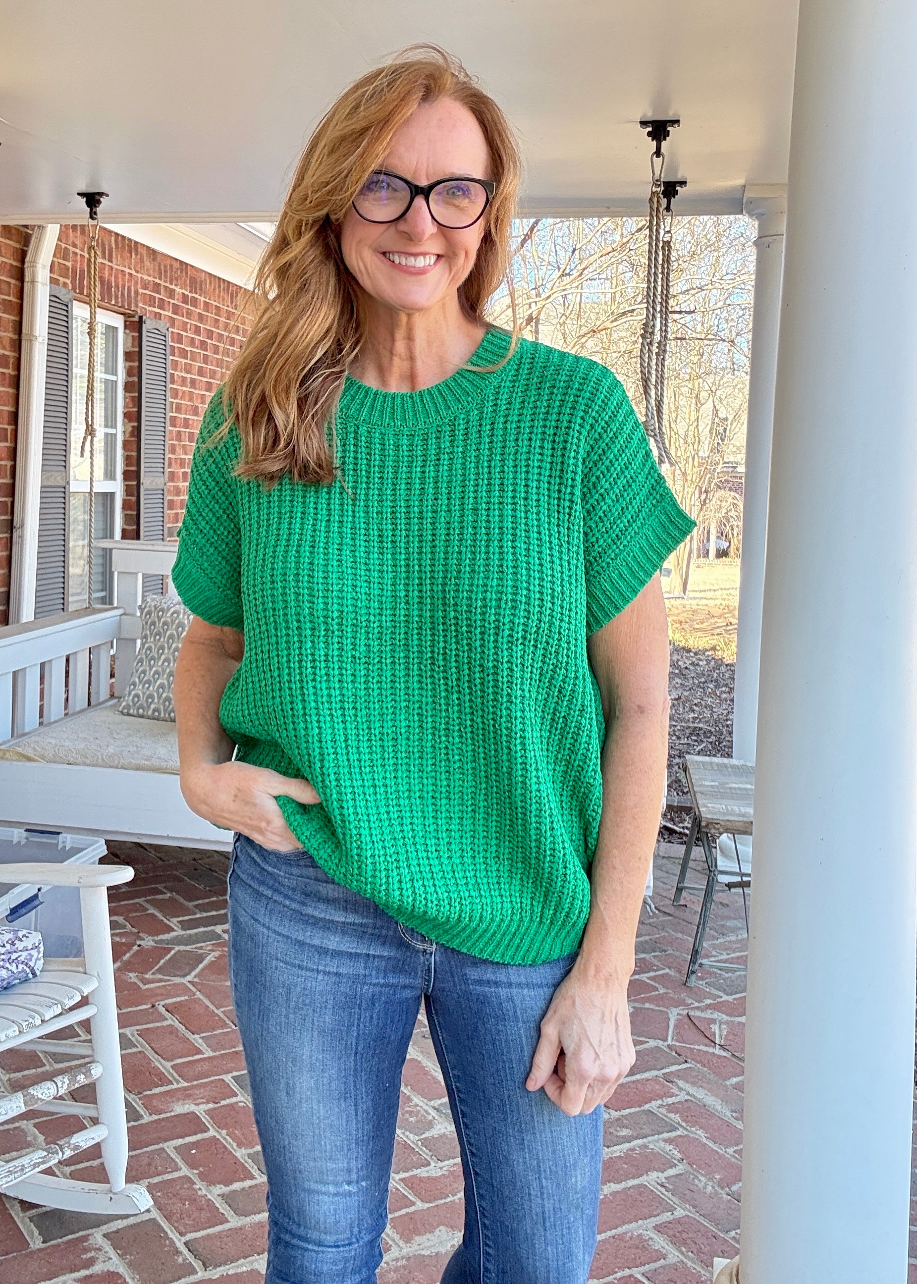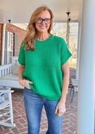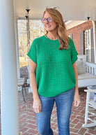 This Kelly Green short sleeve sweater features a round neckline and a relaxed, roomy fit. It measures approximately 23.25" in total length and 49" across the chest (size S/M). Crafted from a soft blend of 75% acrylic and 25% nylon, it offers comfortable wear with a stylish edge.