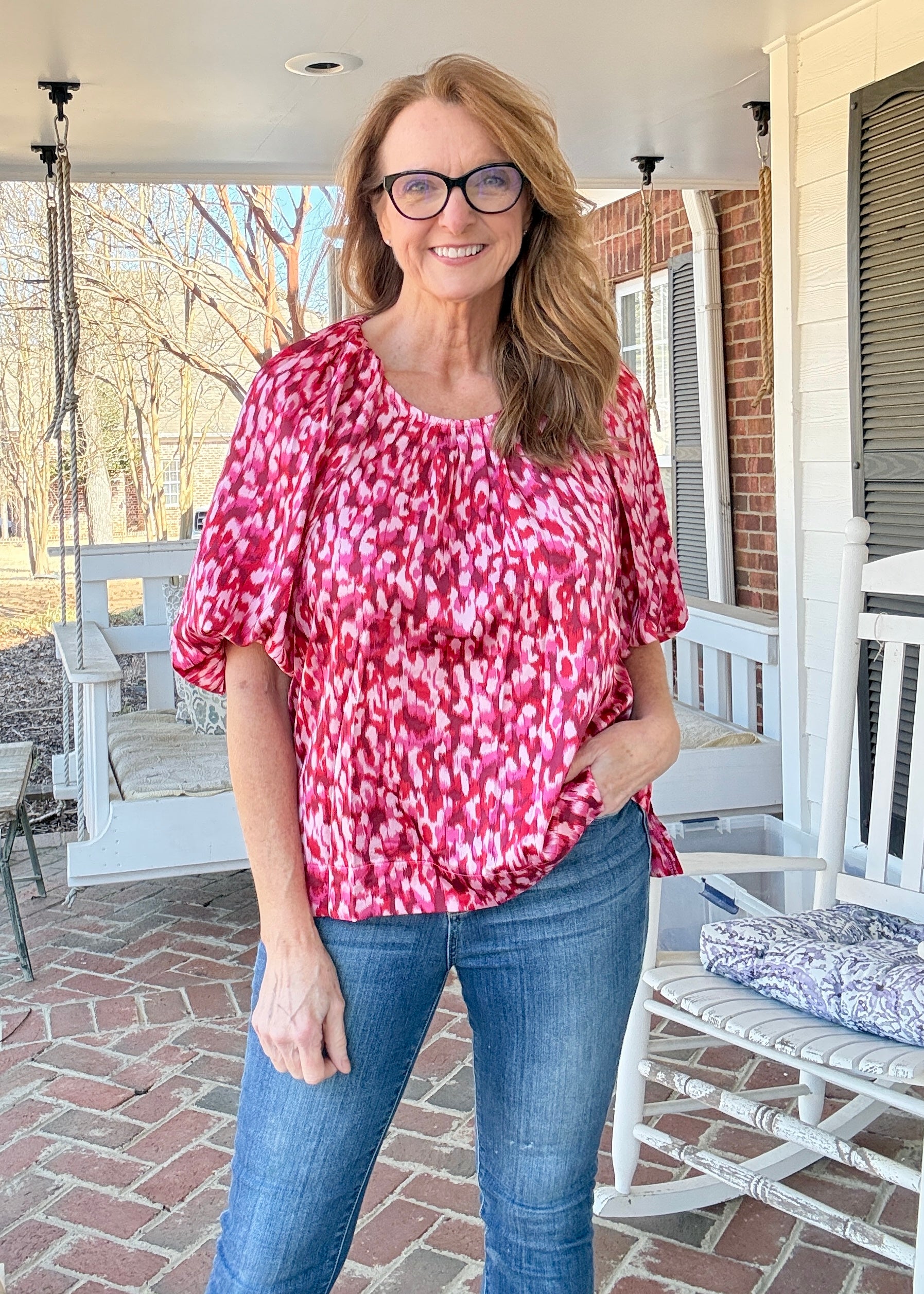 Add a pop of color and effortless charm to your wardrobe with the Pink Mix Puff Sleeve Top, available at Jimberly’s Boutique in Olive Branch, Mississippi. This eye-catching abstract print blouse features soft puff sleeves and a classic round neckline, creating a flattering silhouette that’s both stylish and comfortable.
