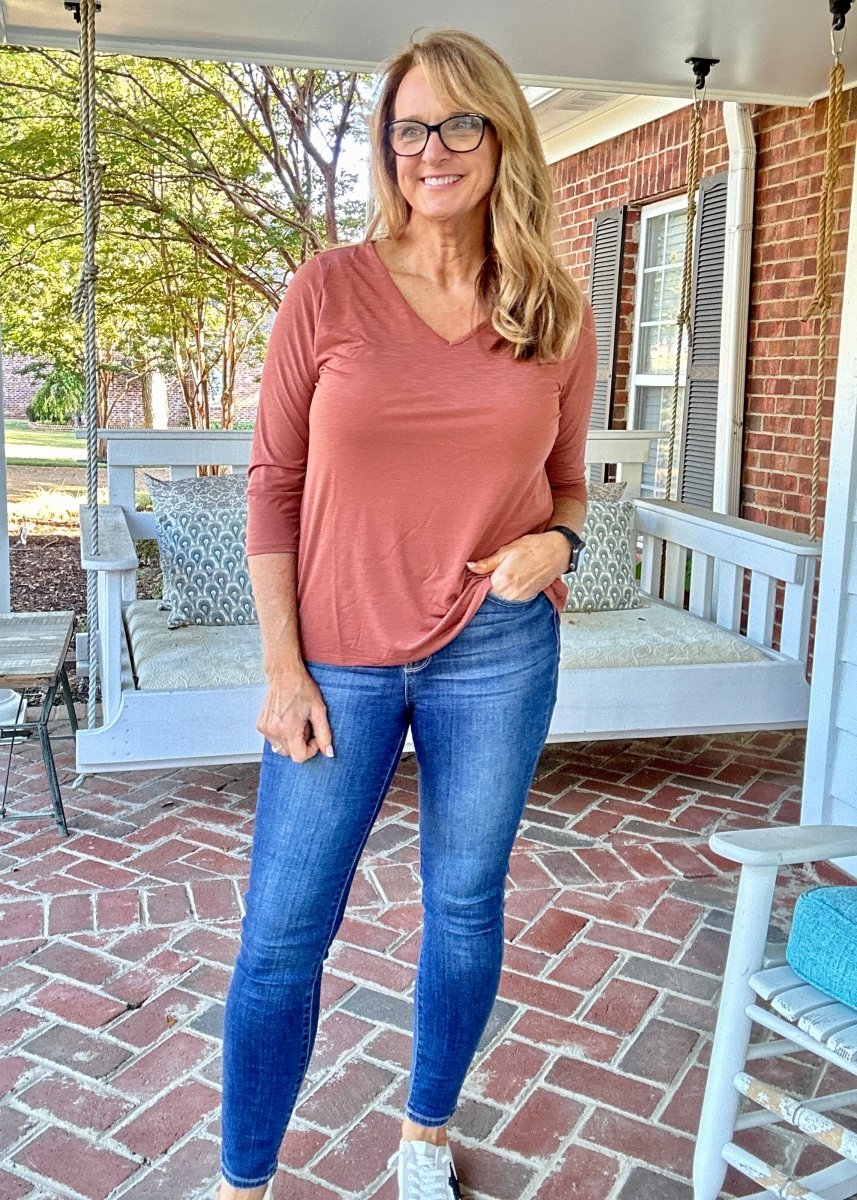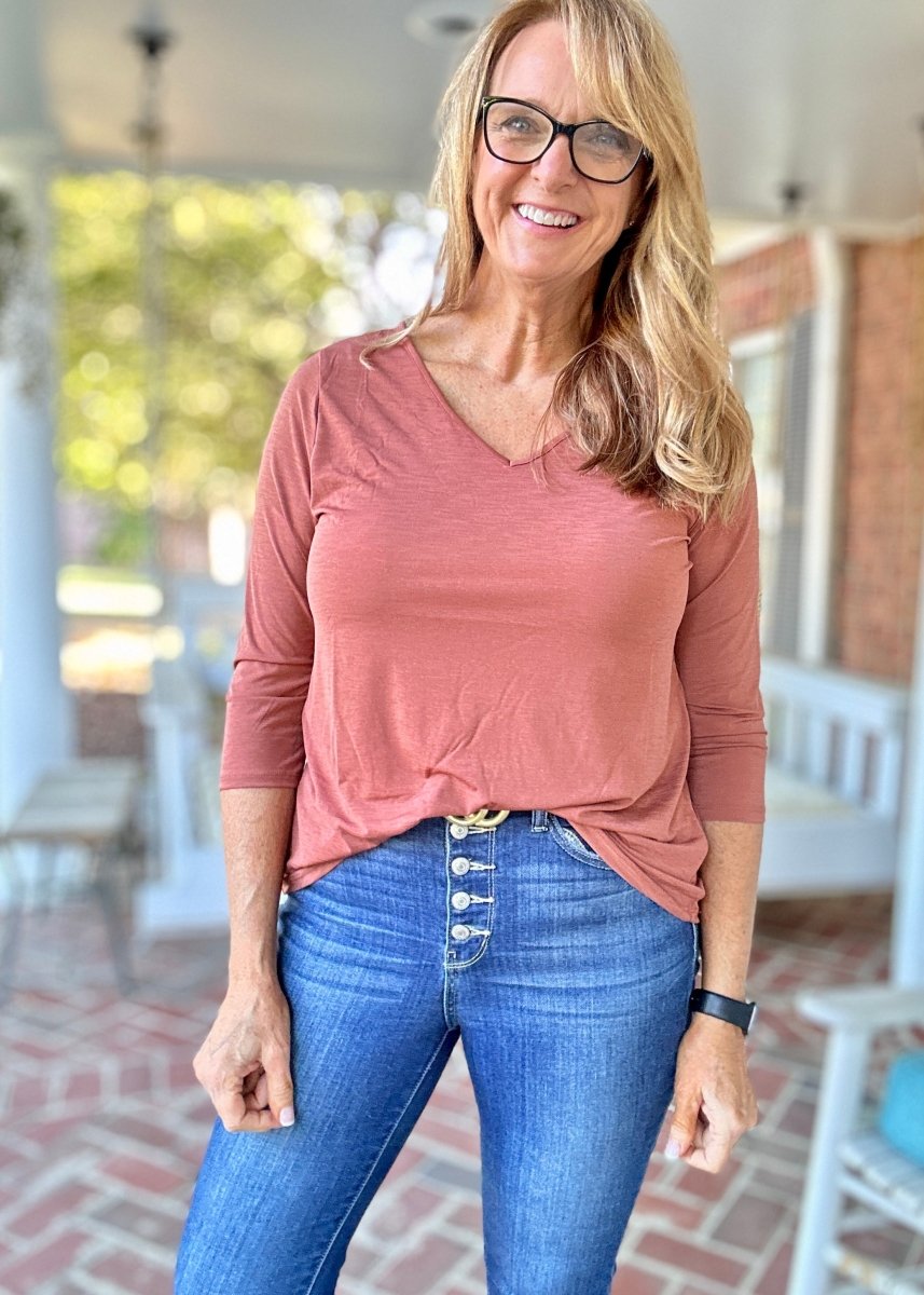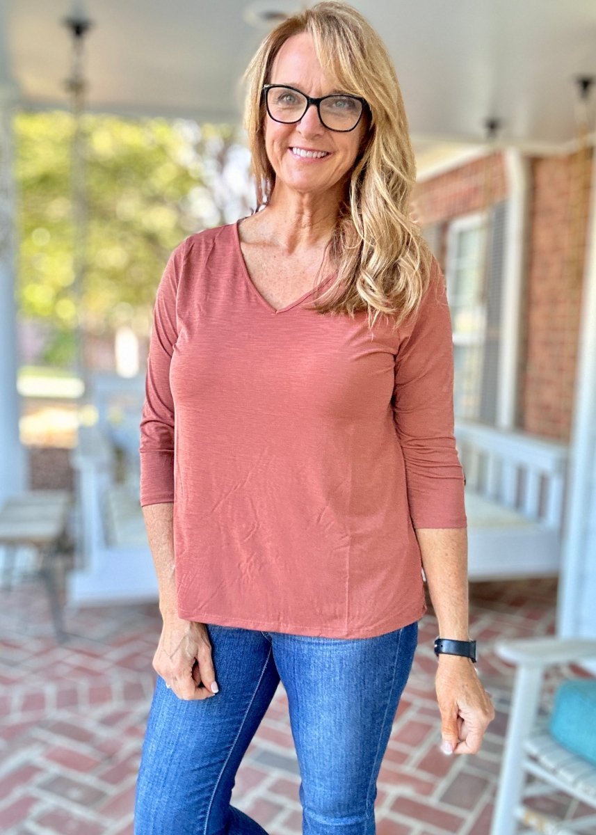 Wrinkle Free V Neck Top - Rust | Dear Scarlett
