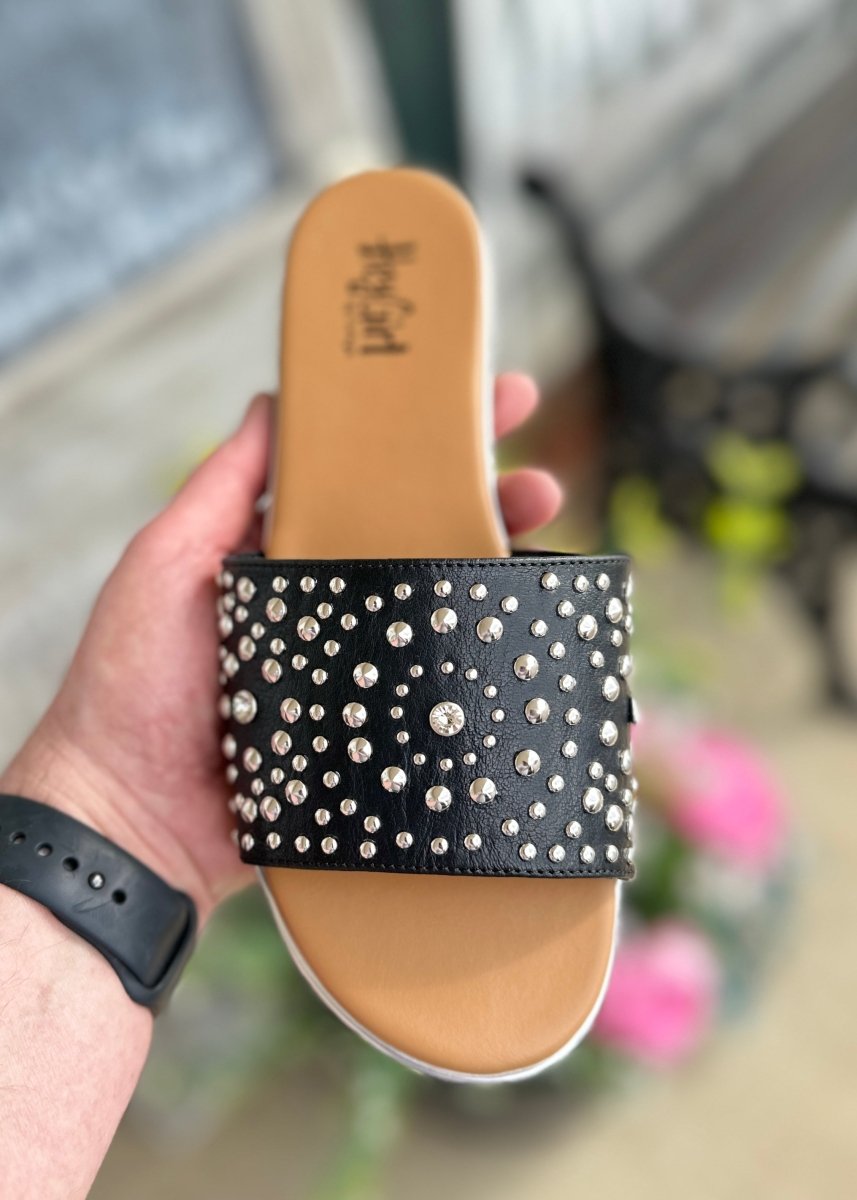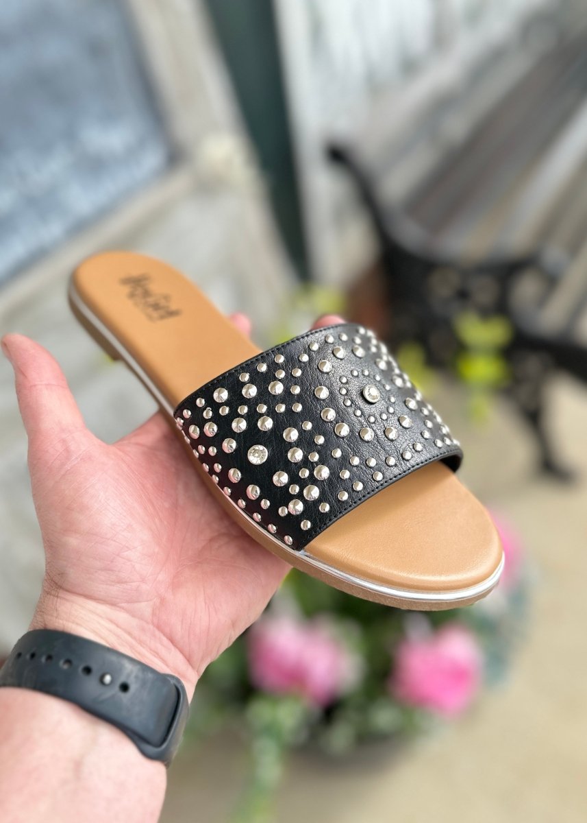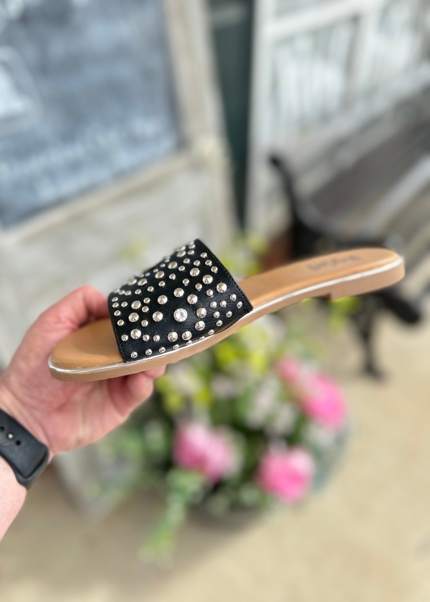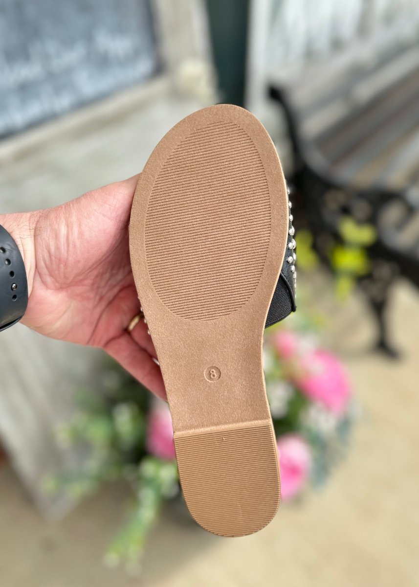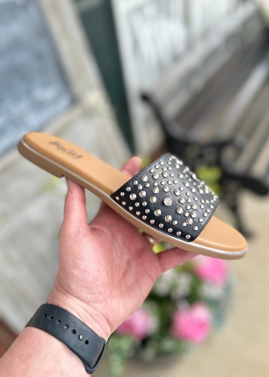 This elegant sandal is beautifully embellished with shimmering silver studs and radiant rhinestone accents, enhancing any ensemble with a glamorous flair. The design is further elevated by the silver piping around the footbed, adding a refined and polished look.