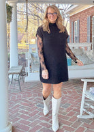 Kim is 5'9", 170 lbs, & is wearing a size Large. Kim has the dress paired with one of our layering tops.