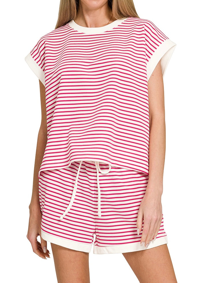 Stripe Contrast Trim Shorts Set - Hot Pink