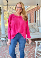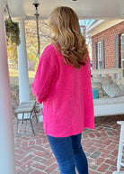 Rock that playful vibe in this hot pink sweater designed for maximum comfort and style. The hi-low hem creates an effortlessly chic silhouette, while strategic side slits add movement and flair. Exposed seams give it an edgy, modern touch that stands out from the ordinary. Crafted from a stretchy blend of polyester, rayon, and spandex, this piece hugs you in all the right ways. Front length hits at 24.5" with a longer 26.5" back, and the 46" chest measurement (based on S/M sizing) ensures a flattering fit for all your adventures.