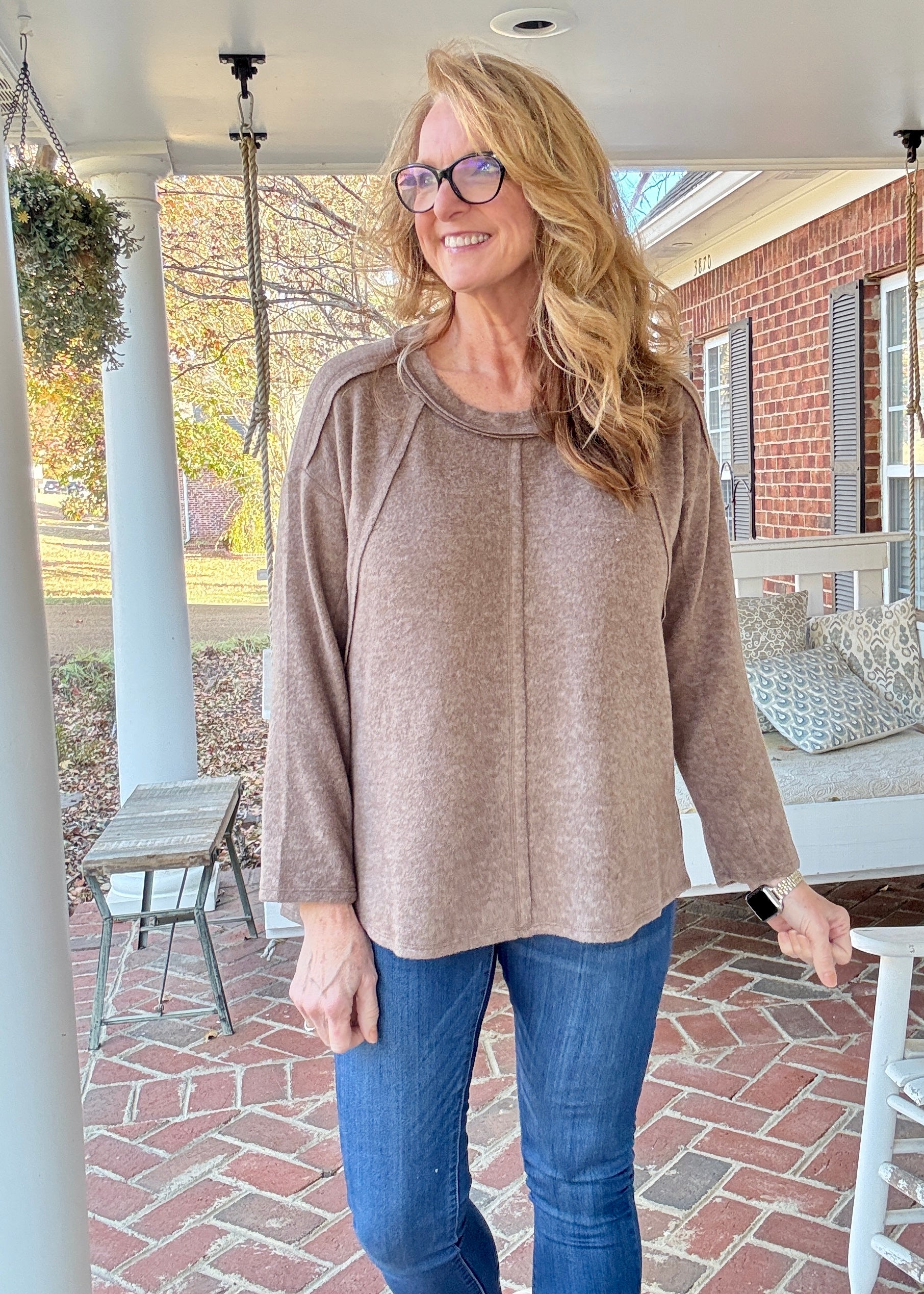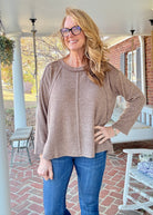 Cozy up in this mocha sweater that's anything but boring! The hi-low hem and cheeky side slits add movement and personality, while exposed seams give it an edgy vibe. Crafted from a stretchy blend of polyester, rayon, and spandex, it hugs you just right without feeling restrictive. Perfect for those "sweet dreams" moments when you want comfort that actually looks good. Front length hits at 24.5", back at 26.5", with a 46" chest—measured from size S/M.