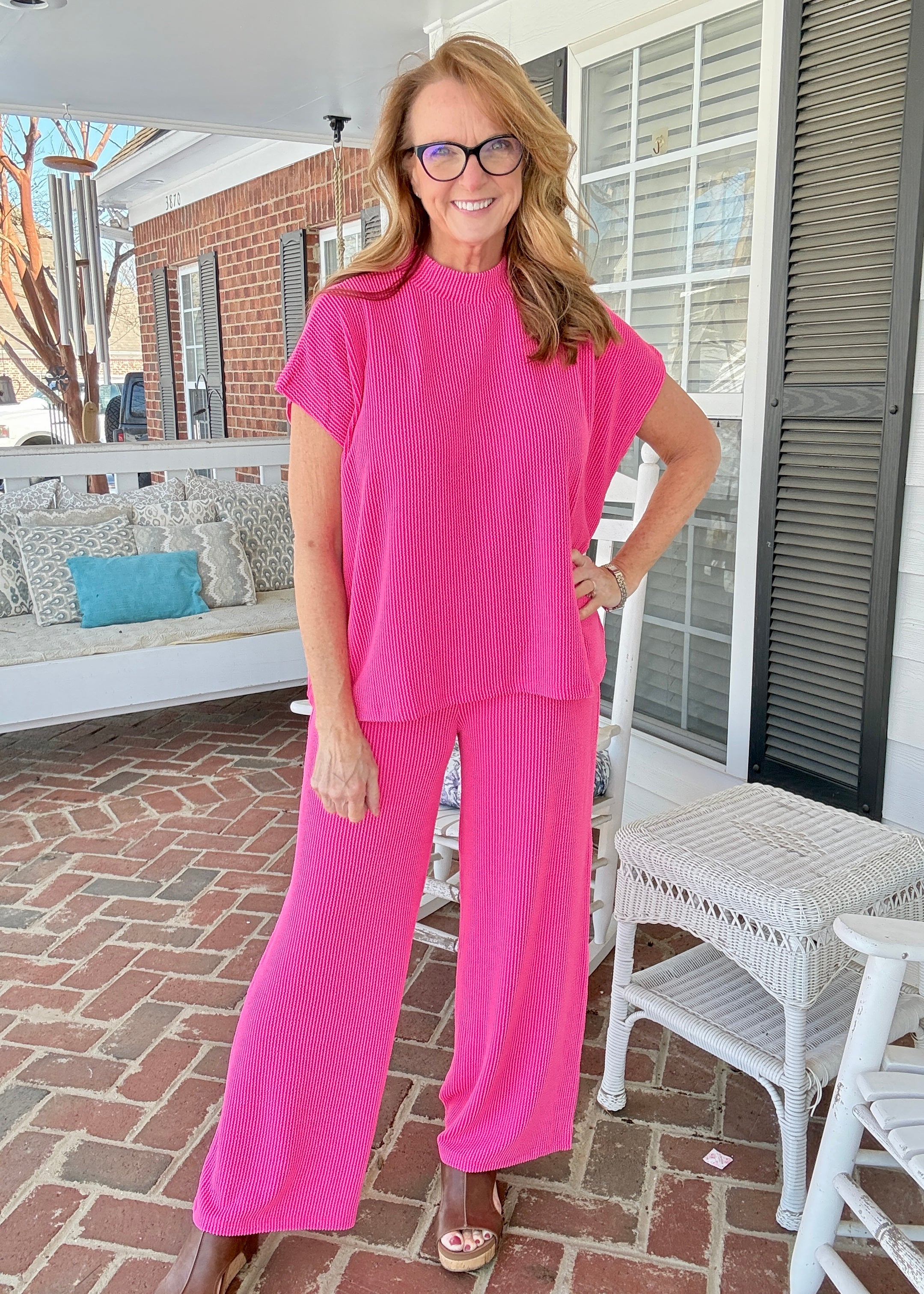 Turn heads while staying comfortable in the Abby Raised Rib Pants Set in Hot Pink — a bold and beautiful two-piece outfit designed for effortless style. This matching set features a raised rib short-sleeve mock-neck tee paired with wide-leg pants for a modern, flattering silhouette.